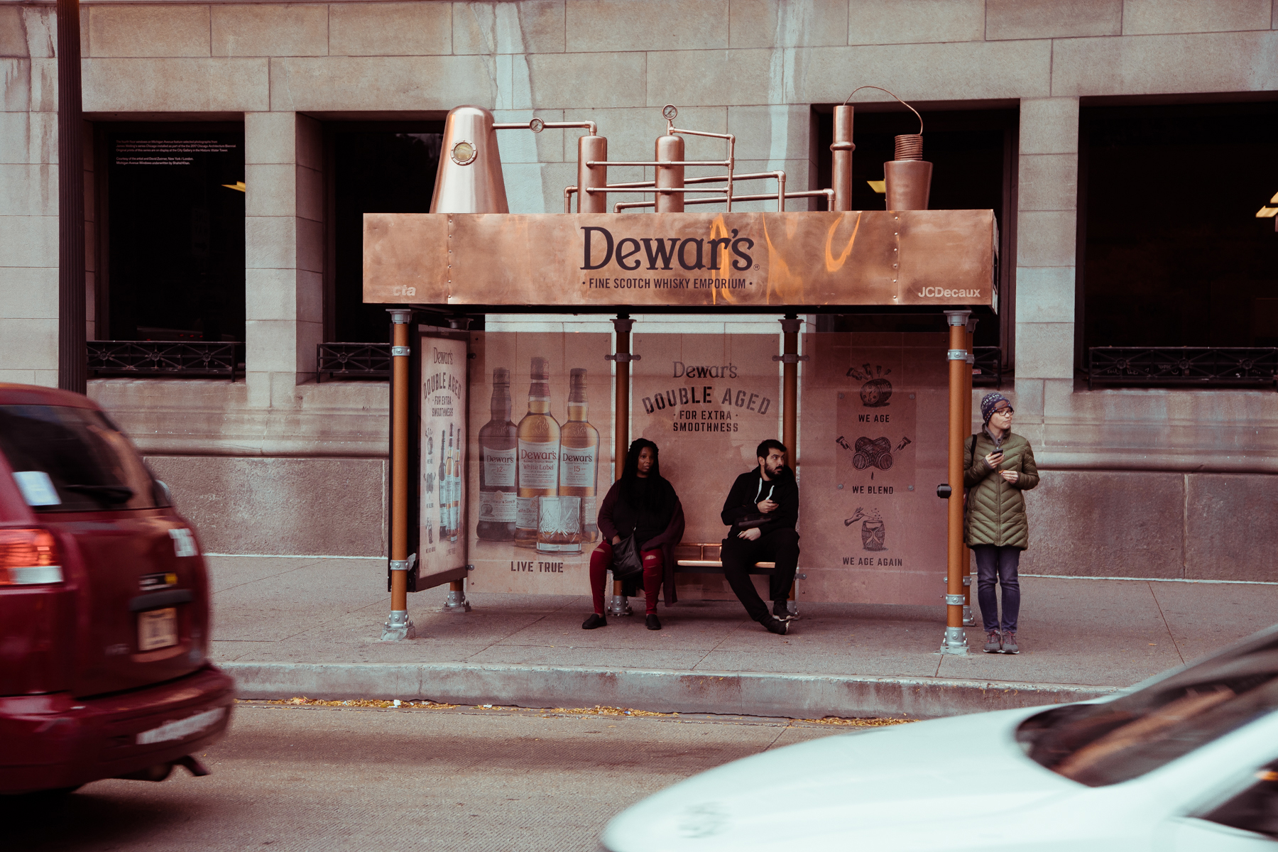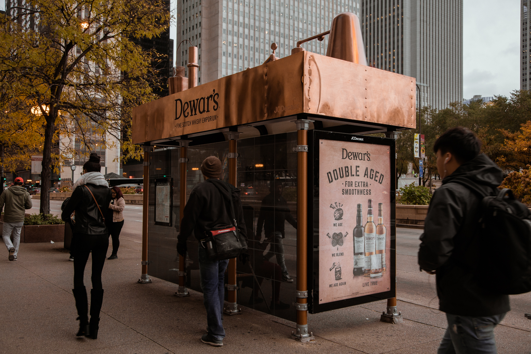 Dewar's transformed a Chicago bus shelter into a mock distillery. Dominating the entire bus stop in faux copper and wrapping the panels in crafty artwork, Chicagoans could envision the smooth taste of their favorite scotch whisky blend.