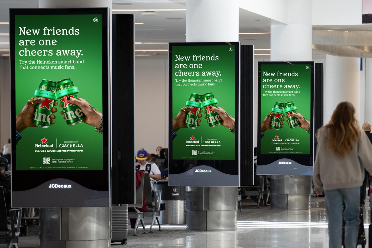 Heineken, a Coachella partner for 23 years, consistently utilizes JCDecaux inventory at LAX to drive brand recall. This year, the brand used airport OOH to support its "Clinker" activation, which used smart devices to encourage real-world social interaction. The “Clinker” is a smart band that wraps around Heineken cans and glasses, transforming every cheers into an opportunity for festival connection among users. By deploying creative across digital and static displays at the entertainment capital's primary hub, Heineken leverages the fact that OOH media maintains the highest consumer recall rate at 86%—outperforming radio, podcasts, online ads, and TV streaming. This strategy ensures that the brand is established as a primary fixture of the festival experience before attendees even reach the desert. Heinekens campaign at LAX poses as a gold standard example for brands activating at global events and further emphasizes that activations truly begin at the airport.