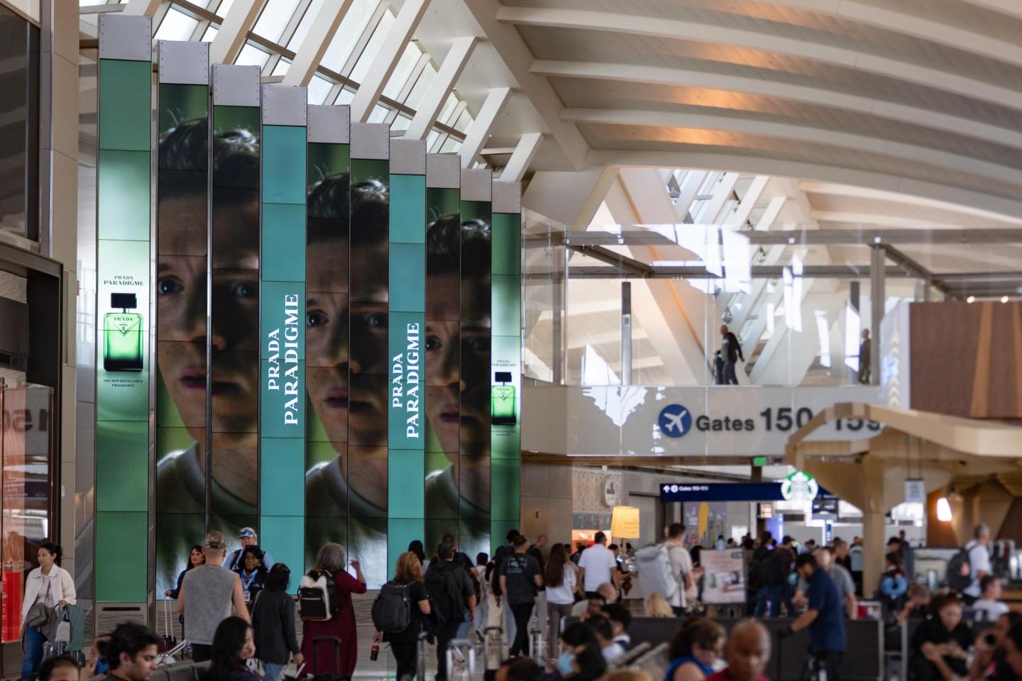 Similarly, Giorgio Armani and Yves Saint Laurent executed a TSA domination in LAX, capitalizing on the significant dwell time of TSA lines. This guaranteed period of forced attention provides a captive audience for high-impact, full-motion digital screens that deliver a memorable brand experience during a low-distraction window of the travel journey. The campaign's strength was in its creative, which strategically showcased high-profile celebrity endorsers like singer Dua Lipa for Yves Saint Laurent and actor Tom Holland for Prada. This choice is key, as it directly leverages the 71% of consumers who report being more likely to purchase a product based on celebrity endorsement.